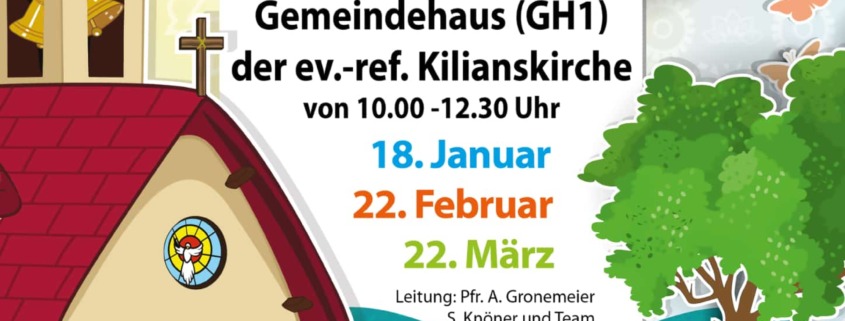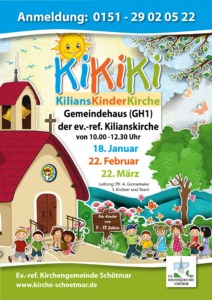 Die KiliansKinderKirche (KiKiKi) findet (in der Regel) an jedem dritten Sonntag im Monat ab 10.00 Uhr in der evangelischen Kilianskirche statt. (Maßgeblich sind dabei immer die Termine auf den aktuellen Plakaten.)