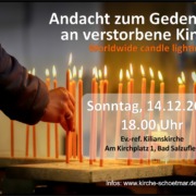 Aus der GemeindeDer „Worldwide Candle Lighting Day“ ist ein weltweiter Gedenktag für verstorbene Kinder am 14. Dezember 2025. Ein Licht zu entzünden, ist ein einfaches, aber bedeutungsvolles Zeichen gegen Dunkelheit und Vergessen – und für Verbundenheit mit Trauernden. Zwischen 19.00 und 20.00 Uhr stellen Menschen auf der ganzen Welt Kerzen ins Fenster, sodass eine Lichterkette um den […]