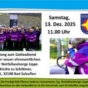 Aus der GemeindeHerzliche Einladung zum Gottesdienst zur Einsegnung der neuen ehrenamtlichen Einsatzkräfte der Notfallseelsorge Lippe. Am Samstag, den 13. Dezember 2025 um 11 Uhr in der Kilianskirche zu Schötmar, (Am Kirchplatz 1, 32108 Bad Salzuflen)